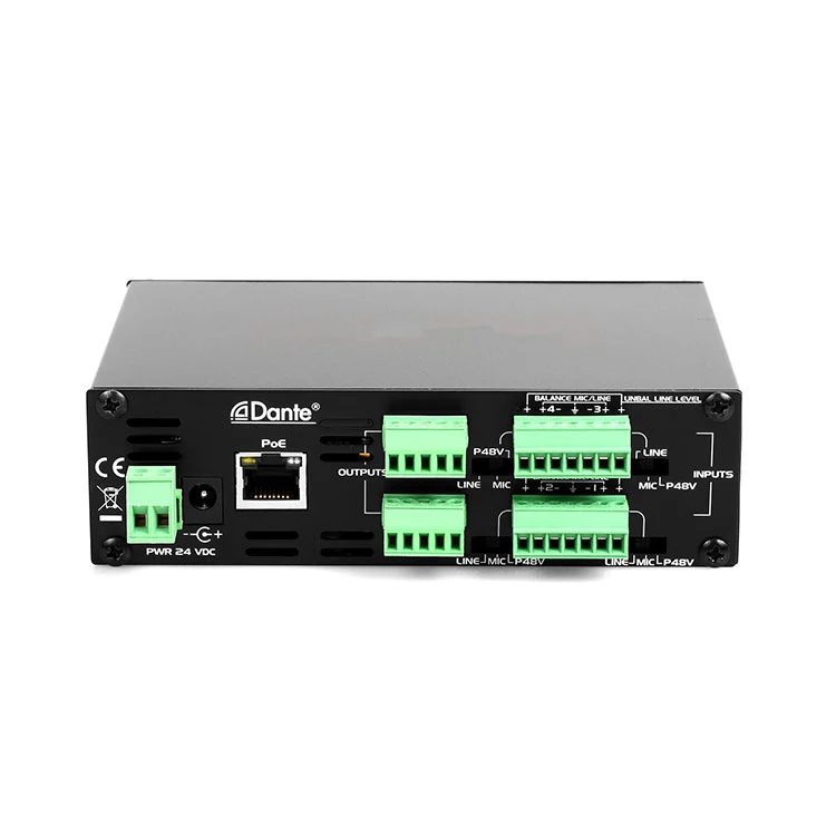 4 MIC ve Line Girişleri Dante Arayüzü, 4 mikrofon/hat girişi ve 4 çıkışı destekleyen Dante Network Protokolüne dayanan profesyonel bir ses arayüzüdür. Temel avantajı, esnek kablolama, uzaktan şanzıman veya çok kanallı ses entegrasyonu gerektiren senaryolar için uygun olan IP ağları aracılığıyla yüksek kaliteli, düşük gecikmeli ses sinyallerini iletmektir.