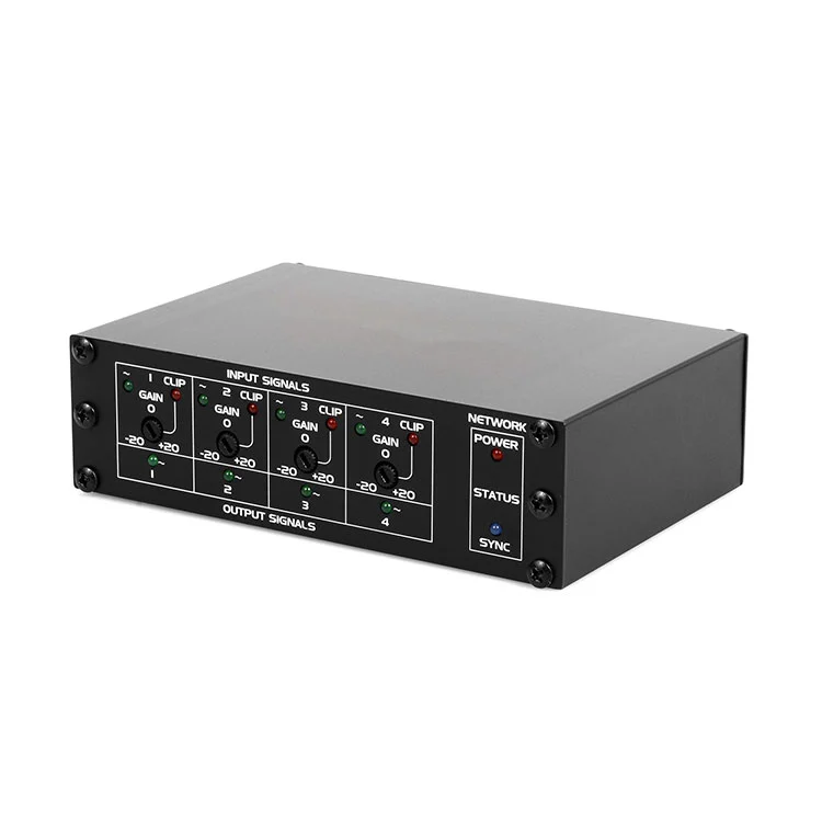 DB0404, dört analog giriş (MIC/hat kazanç kontrolü ve fantom gücü arasında değiştirilebilir) ve dört dengeli analog çıkış sunan kompakt, yüksek kaliteli bir Dante arayüzüdür-hepsi Dante aracılığıyla tamamen yönlendirilebilir.